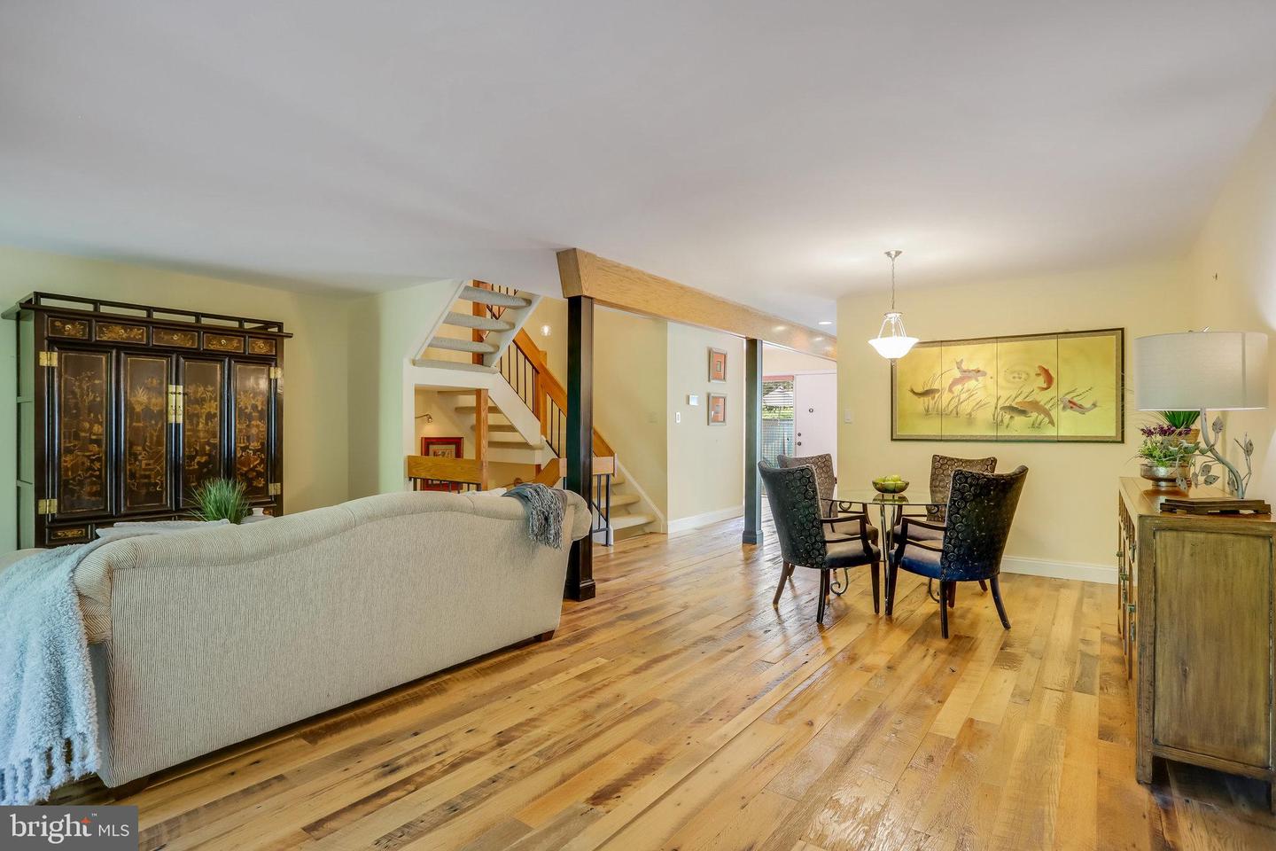Welcome to this exquisite 4 bedroom, 3 and a half bath tastefully updated townhome that perfectly combines modern elegance with comfortable living. The main level boasts stunning hardwood floors creating an inviting and warm ambience throughout the open-concept living space complete with exposed beams to add rustic charm and character. The updated kitchen offers both style and durability with its sleek quartz countertops, high-end stainless steel appliances, and an over-the-range hood, creating a chef's dream! Even the powder room is impeccably updated. The main level is ideal for entertaining guests or enjoying some family time. The upper level boasts 3 spacious bedrooms, one with a coffered ceiling to continue the charm of this home upstairs. The large primary bedroom continues its rustic charm with live edge shelving and has its own private balcony to enjoy a cup of coffee. An ensuite bathroom and adjoining nook with its own refrigerator and microwave create a tranquil and private space.